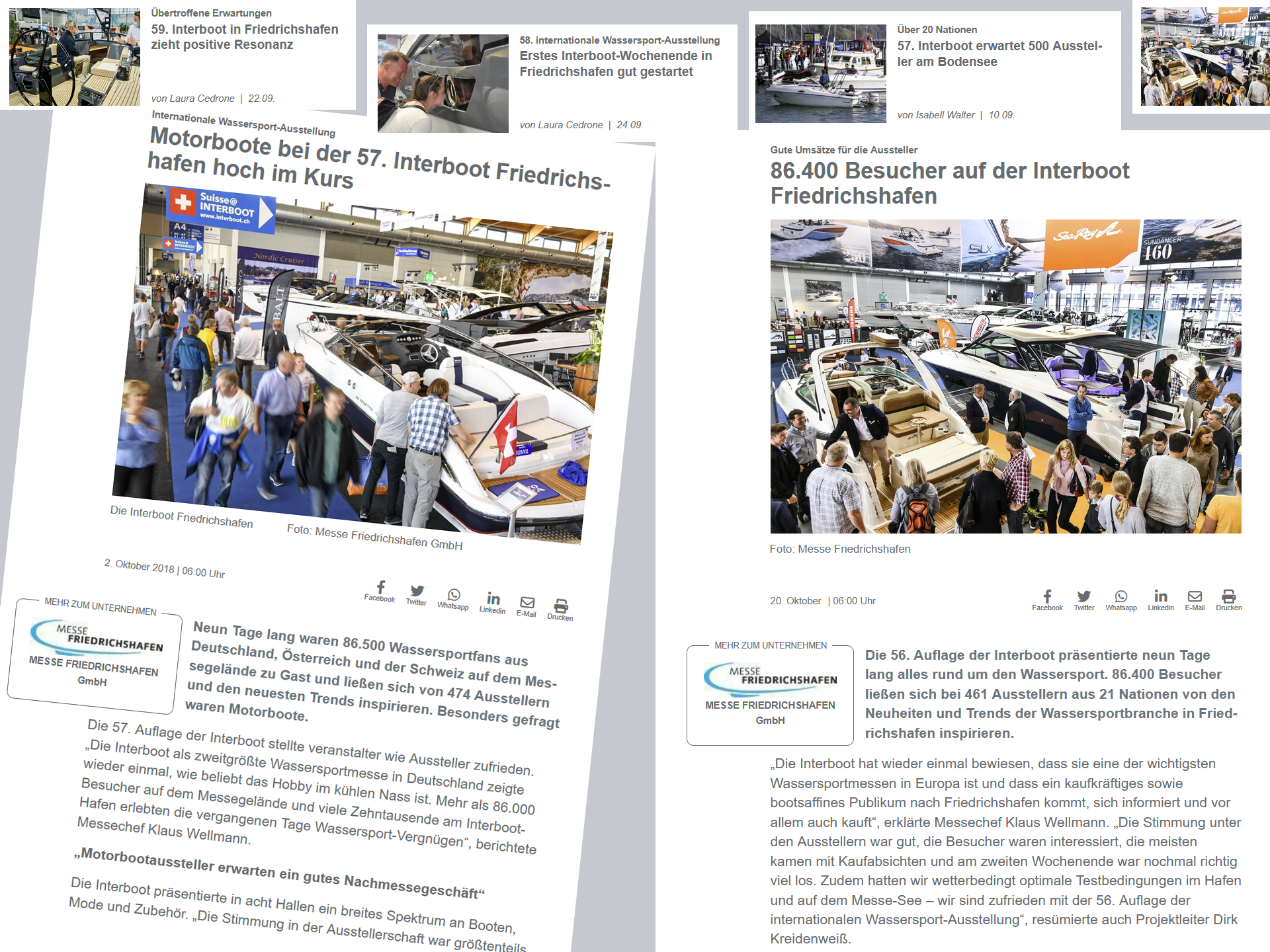 Die INTERBOOT findet jährlich Ende September in Friedrichshafen am Bodensee statt und ist seit 1962 ein zentraler Treffpunkt der Wassersportbranche. Die Messe bietet als Plattform für Segel- und Motorboote sowie Trendsportarten neueste Innovationen und Produkte. Ein besonderes Highlight ist der INTERBOOT Hafen, der einzigartige Probefahrten direkt auf dem Bodensee ermöglicht. Ergänzt wird das Messeerlebnis durch ein vielfältiges Programm aus Vorträgen, Seminaren, Workshops und sportlichen Aktivitäten wie Regatten und Testfahrten – eine Kombination aus Fachkompetenz, Information und Erlebnis, die zehntausende Besucher anzieht.