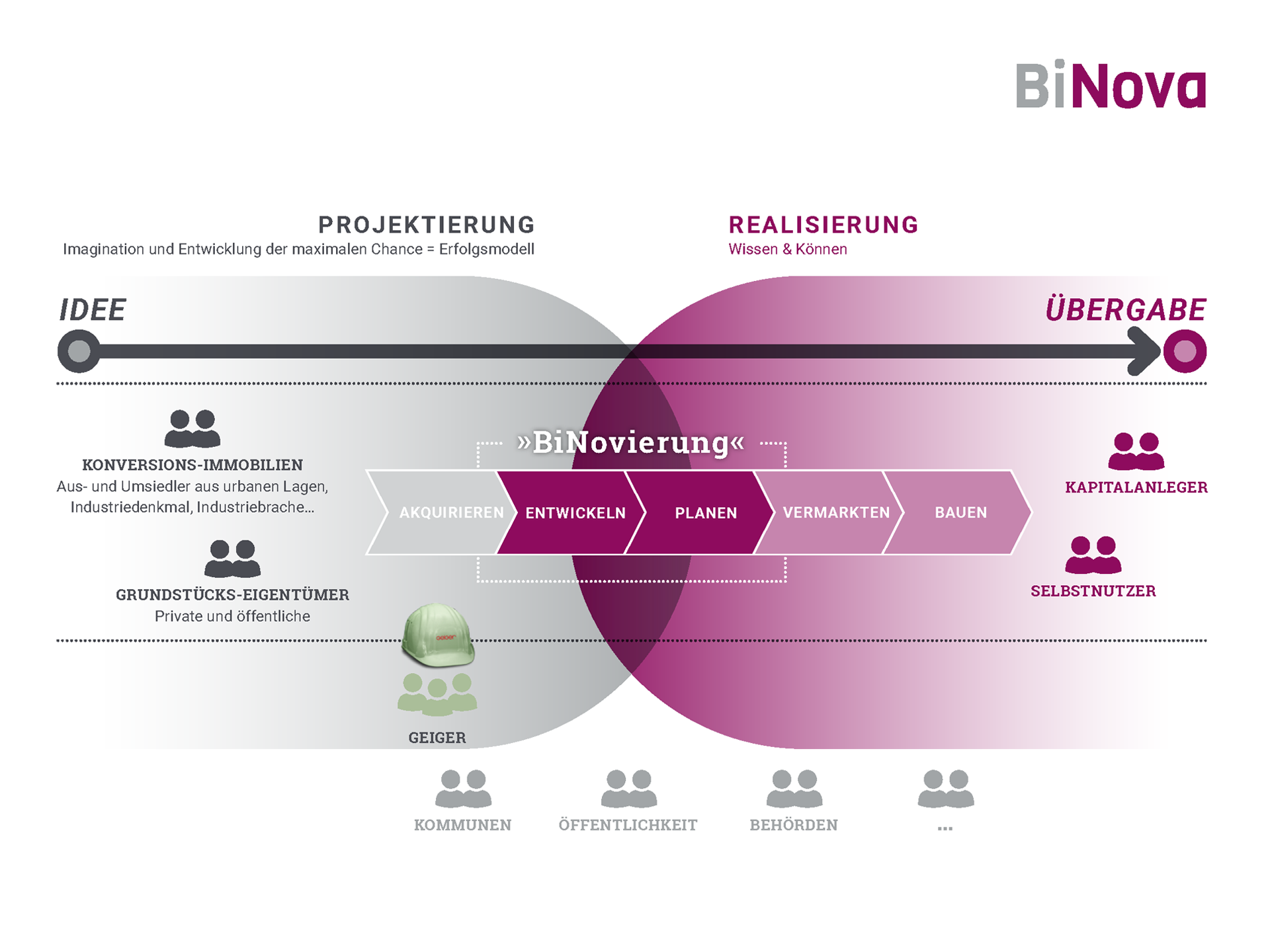 BiNova Immobilien vereint die Phantasie und Erfahrung der Immobilienvisionäre Sandra und Willi Schmeh mit der Kompetenz der Geiger Unternehmensgruppe. Gemeinsam entstehen unter der Marke BiNova“ außergewöhnliche Wohnprojekte, in denen Wohnstil, Lage und Landschaft harmonisch miteinander verschmelzen. Historische Elemente werden sensibel integriert, um die Geschichte der Orte lebendig zu halten.